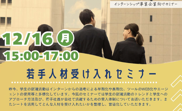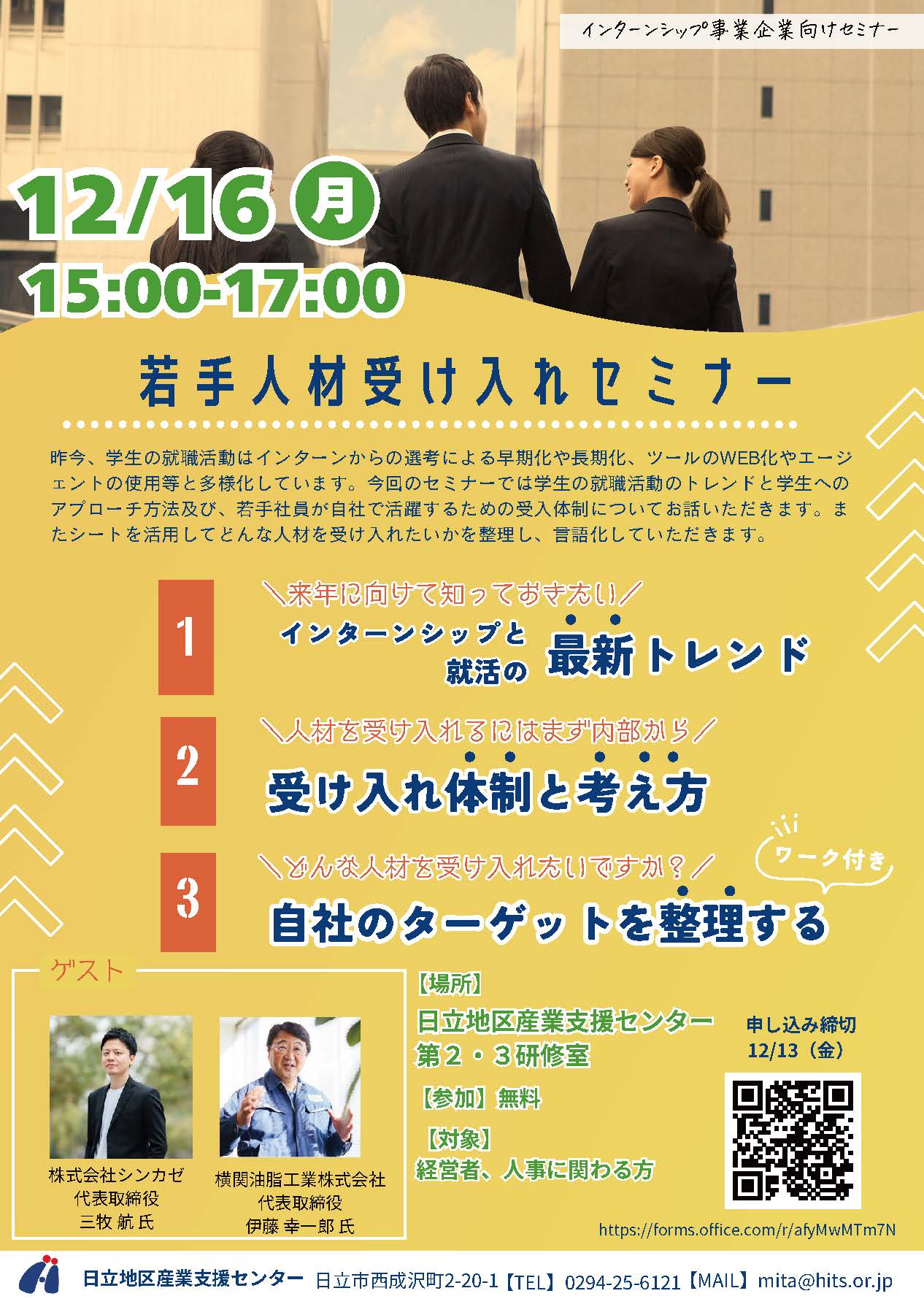 ホームイベント12月16日(月)茨城県日立市「若手人材受け入れセミナー」を開催いたします。 2024-11-01 イベント, セミナー・研修12月16日(月)茨城県日立市「若手人材受け入れセミナー」を開催いたします。 12月16日(月)に「日立地区産業支援センター」が主催する「若手人材受け入れセミナー」を開催いたします。 セミナー概要 開催日時:2024年12月16日(月)15時00分~17時00分 開催場所:日立地区産業支援センター 茨城県日立市西成沢町2-20-1 申込期限:2024年12月13日(金)まで お問い合わせ先: 日立地区産業支援センター TEL(0294)25-6121 MAIL:mita@hits.or.jp 一覧ページに戻る→次の記事も読む→