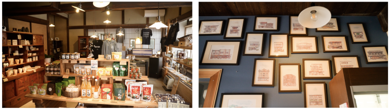 商品に対する愛情と築100年を越える建物が醸し出す温かくてほのぼのした店内には、町産の美味しい⾷べ物や魅⼒的なグッズが所狭しと並んでいます。