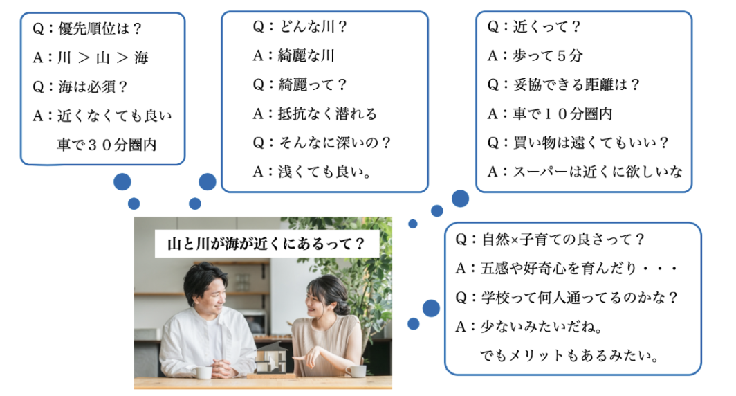 とても素晴らしい想いですが、目的(子育て)も手段(自然豊かな環境で)も具体化する余地に溢れています。 では、どのように具体化していくのか。 自問自答することや誰かに話してみることが効果的です。 自分達が理想としている自然豊かな環境とは、なんだろう? という質問には、「山と川と海が近くにある」など、それぞれの答えが出てくると思います。